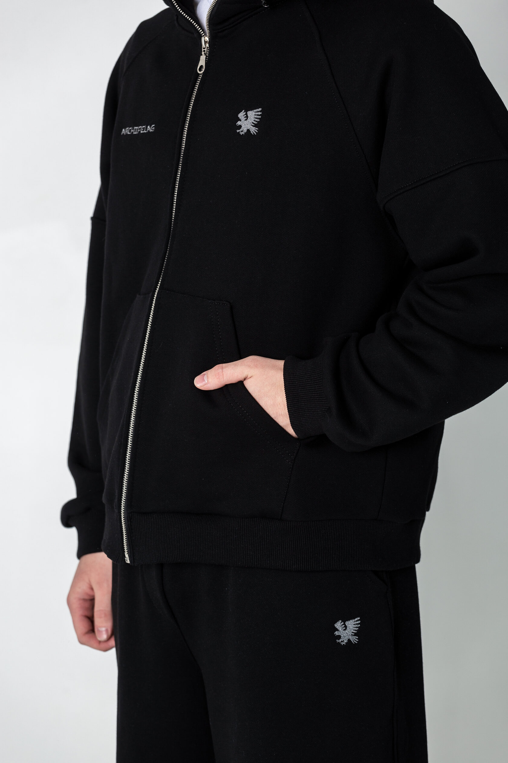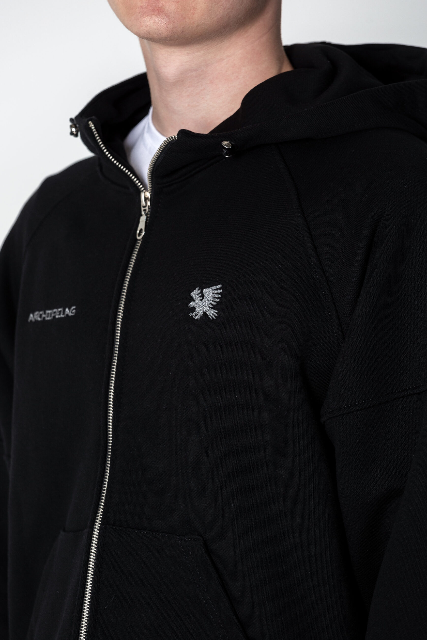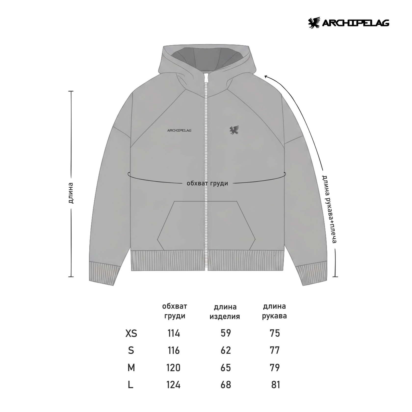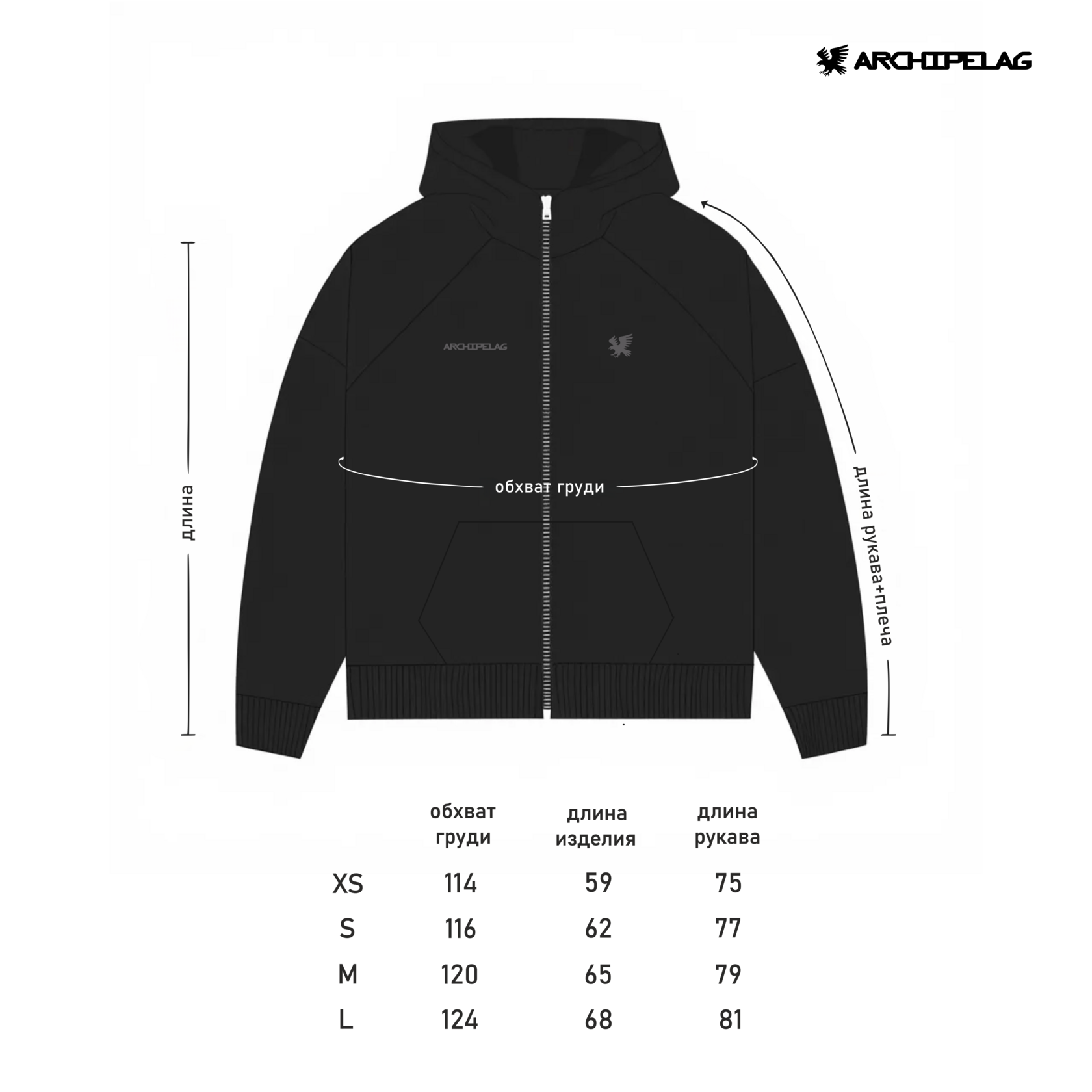 Зип-худи из хлопкового футера плотностью 470 г/м². Украшен объемной вышивкой с фирменными логотипами. Материал — 100% хлопок, устойчивый к деформации и износу. Свободный реглан крой, кроп, молния по всей длине, капюшон с регулируемыми фиксаторами, два передних кармана.
