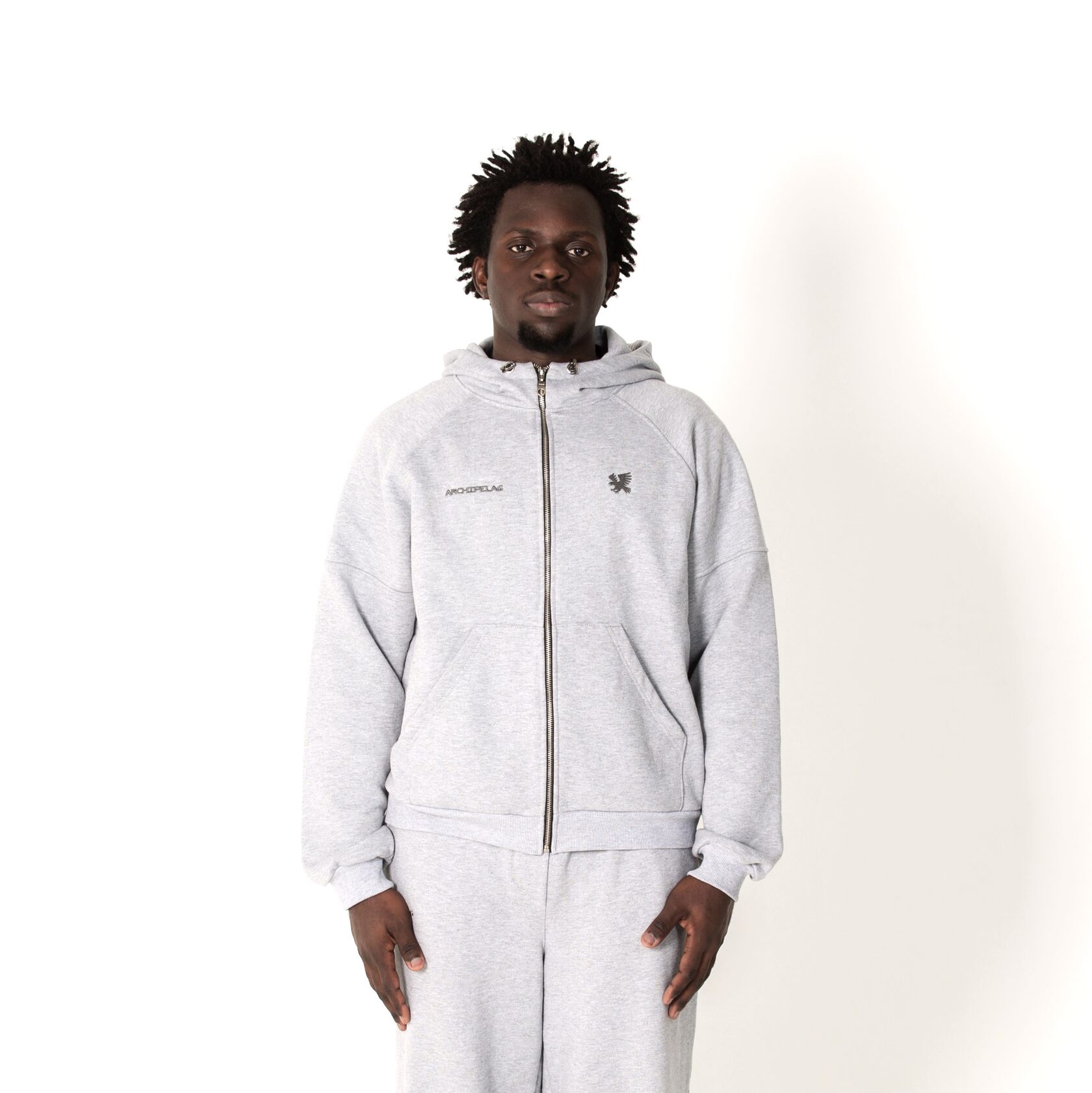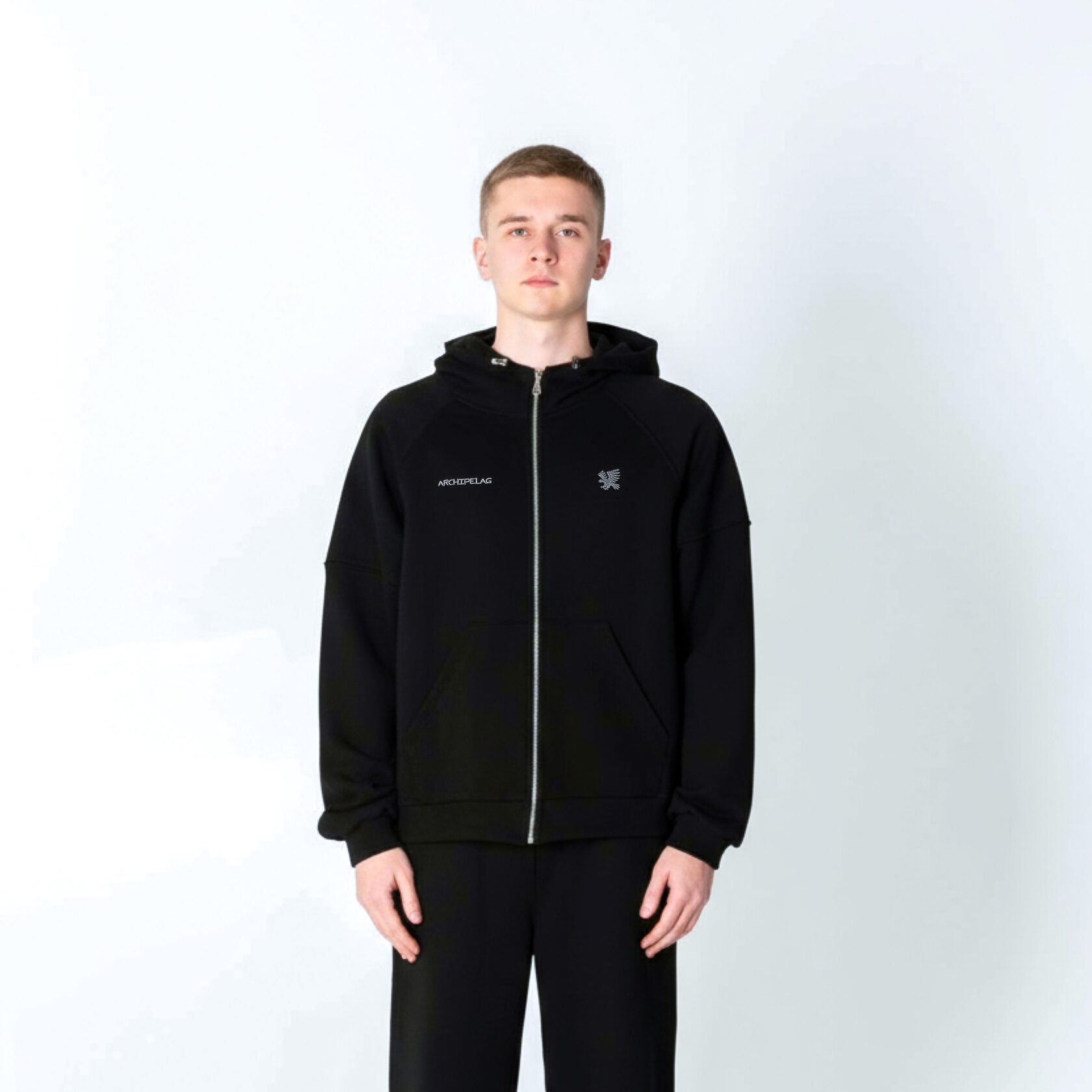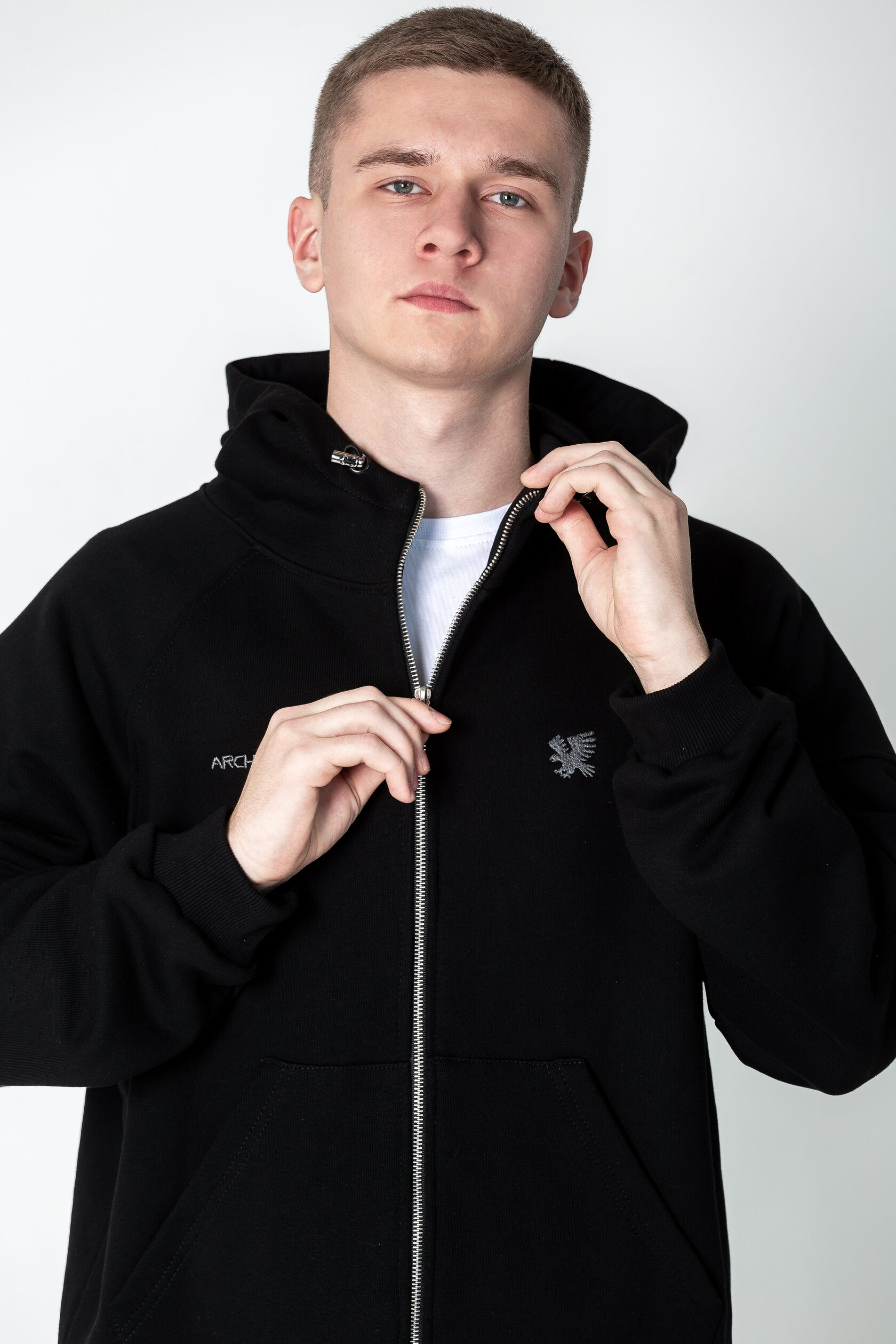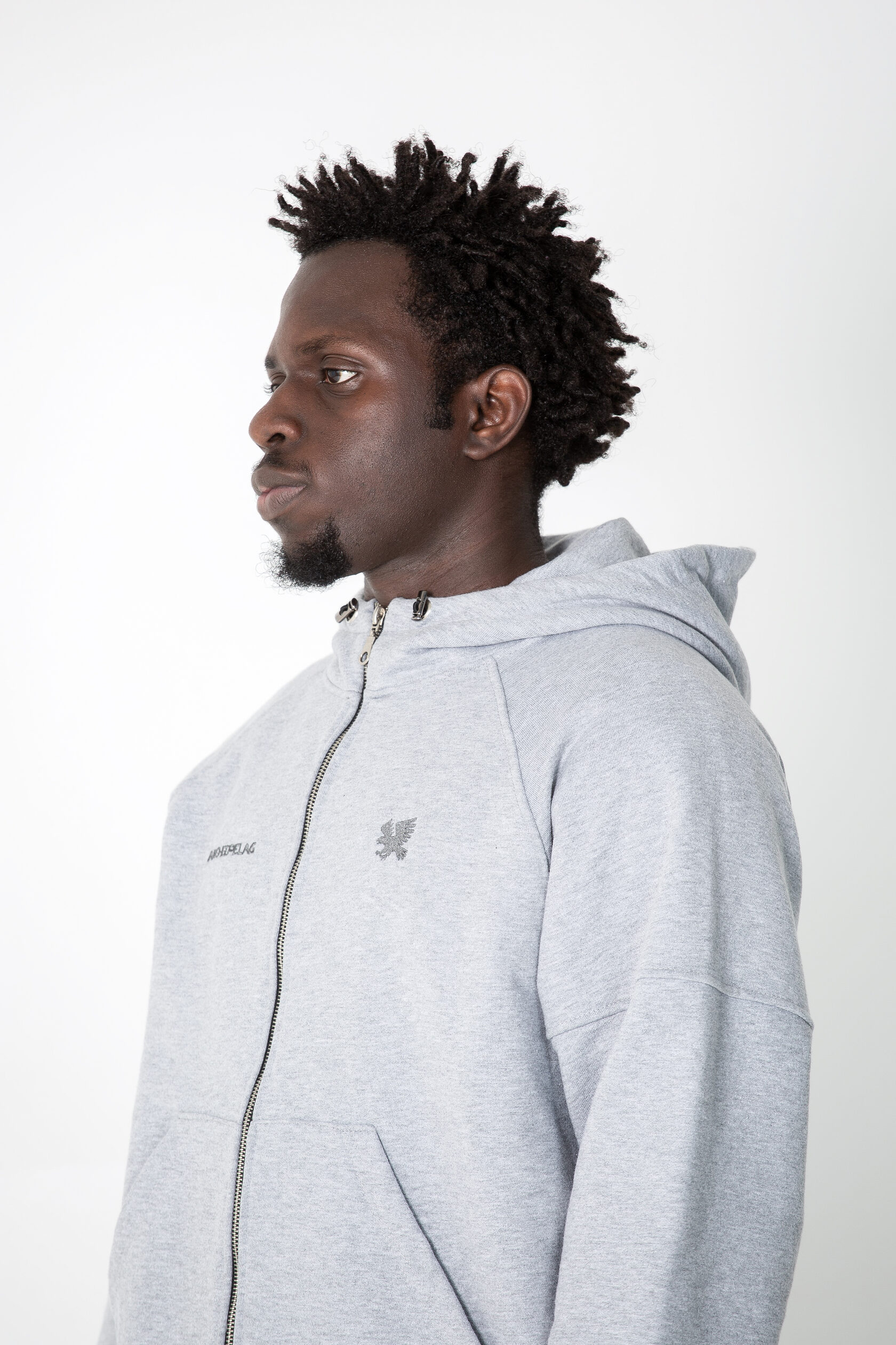 Зип-худи из хлопкового футера плотностью 470 г/м². Украшен объемной вышивкой с фирменными логотипами. Материал — 100% хлопок, устойчивый к деформации и износу. Свободный реглан крой, кроп, молния по всей длине, капюшон с регулируемыми фиксаторами, два передних кармана.