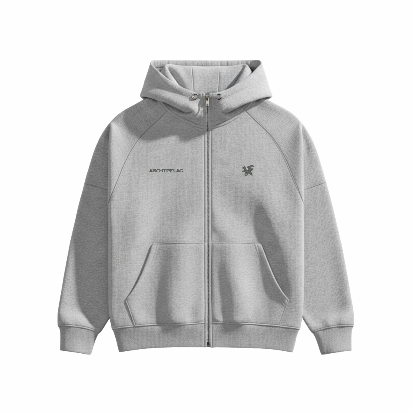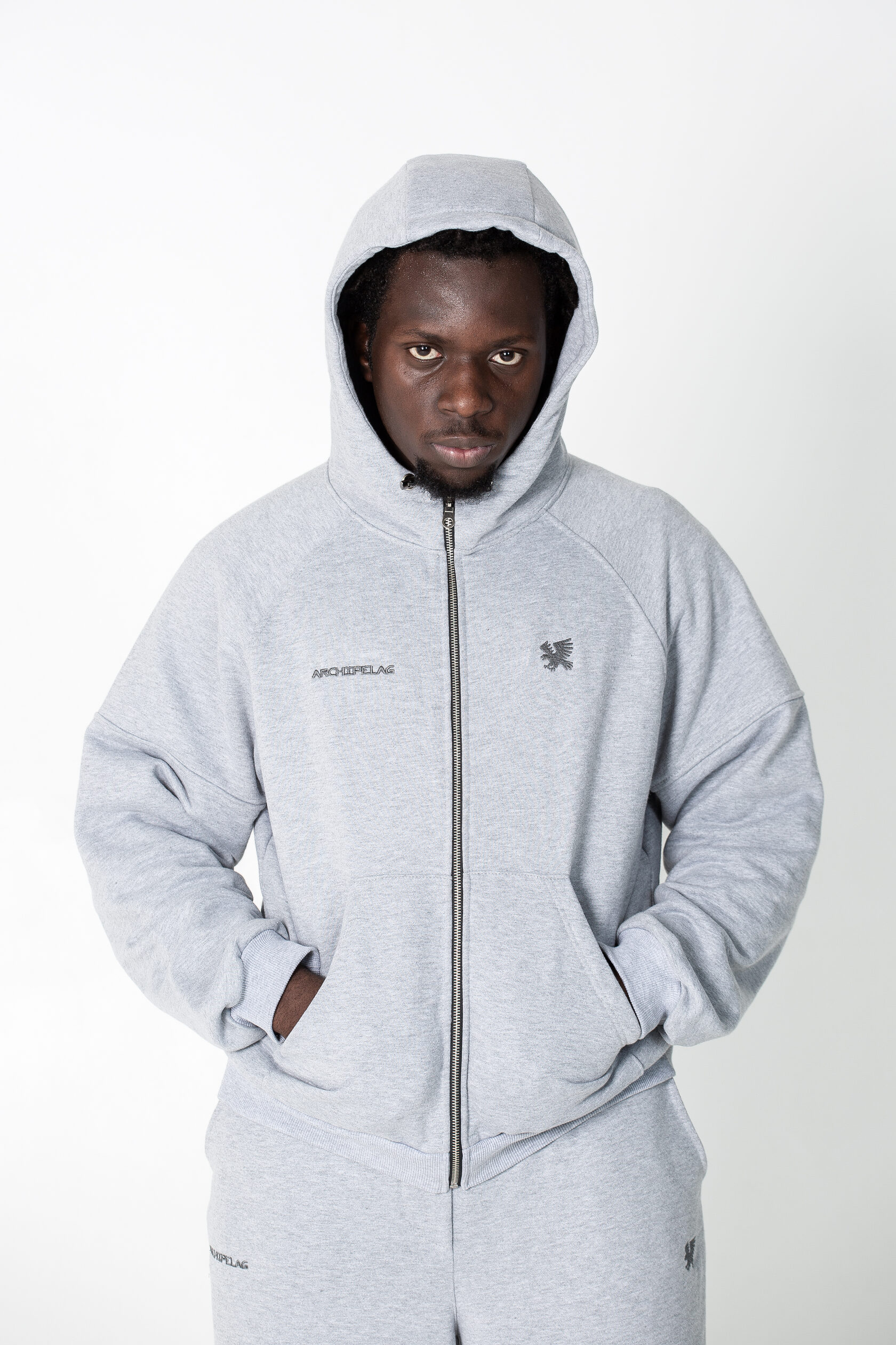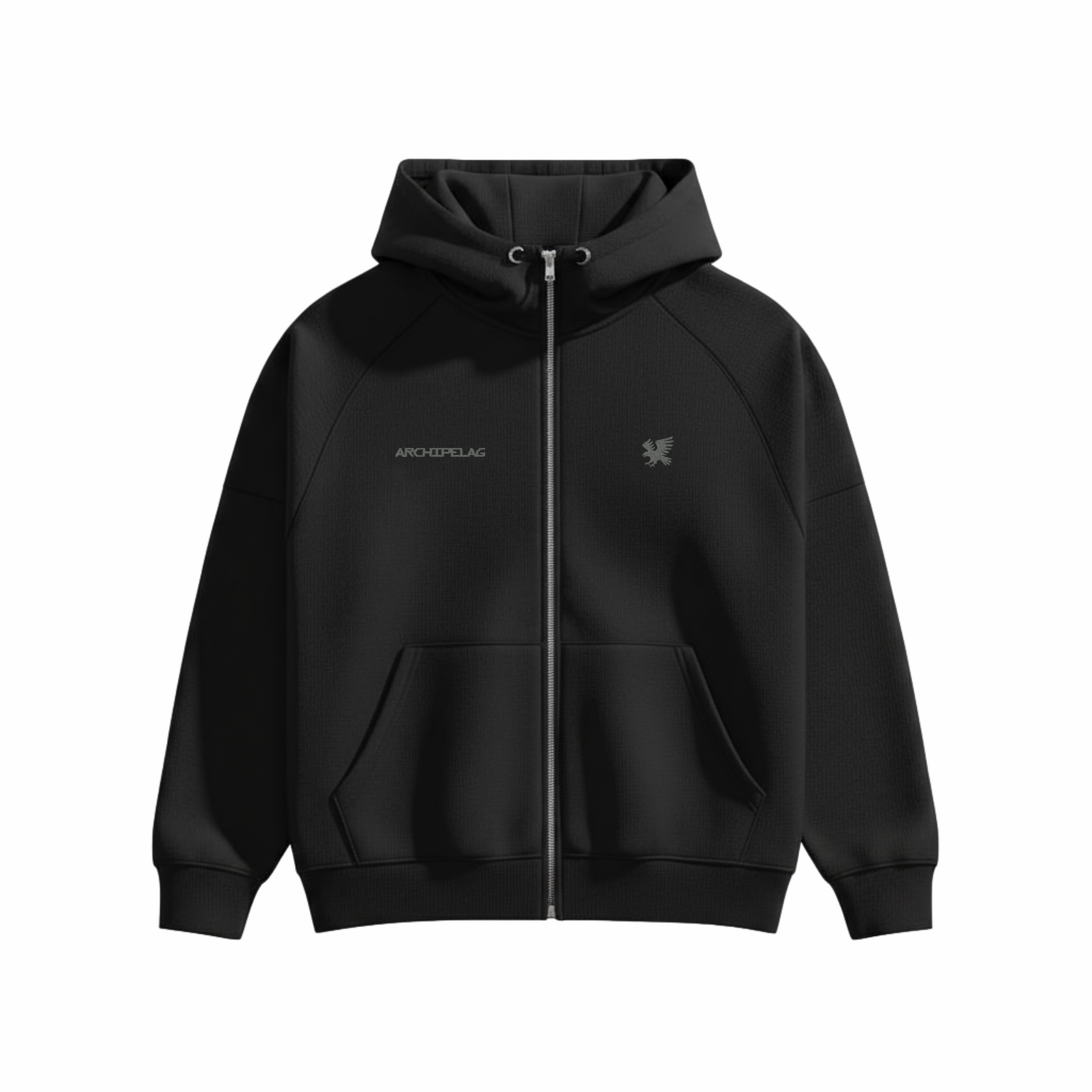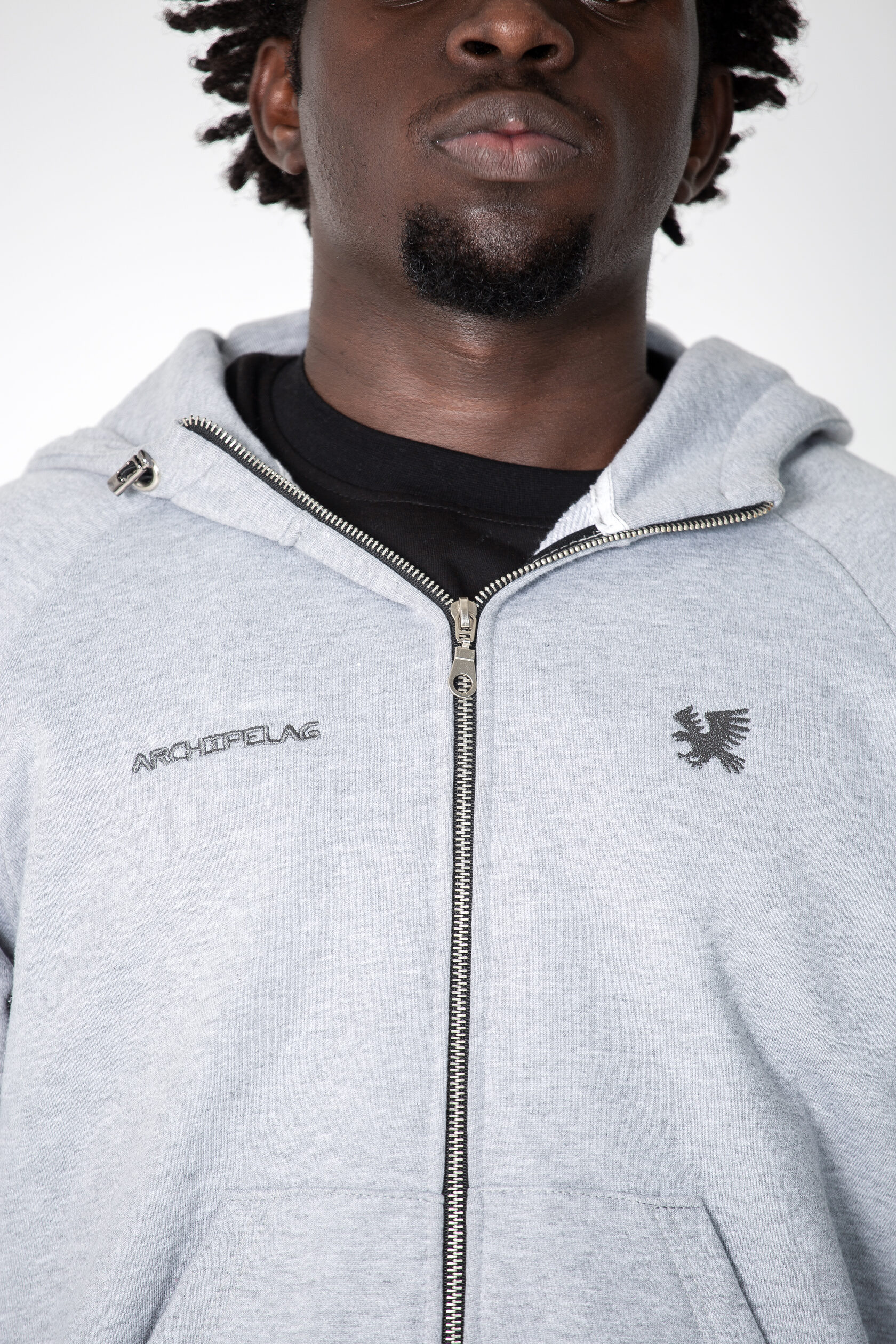 Зип-худи из хлопкового футера плотностью 470 г/м². Украшен объемной вышивкой с фирменными логотипами. Материал — 100% хлопок, устойчивый к деформации и износу. Свободный реглан крой, кроп, молния по всей длине, капюшон с регулируемыми фиксаторами, два передних кармана.