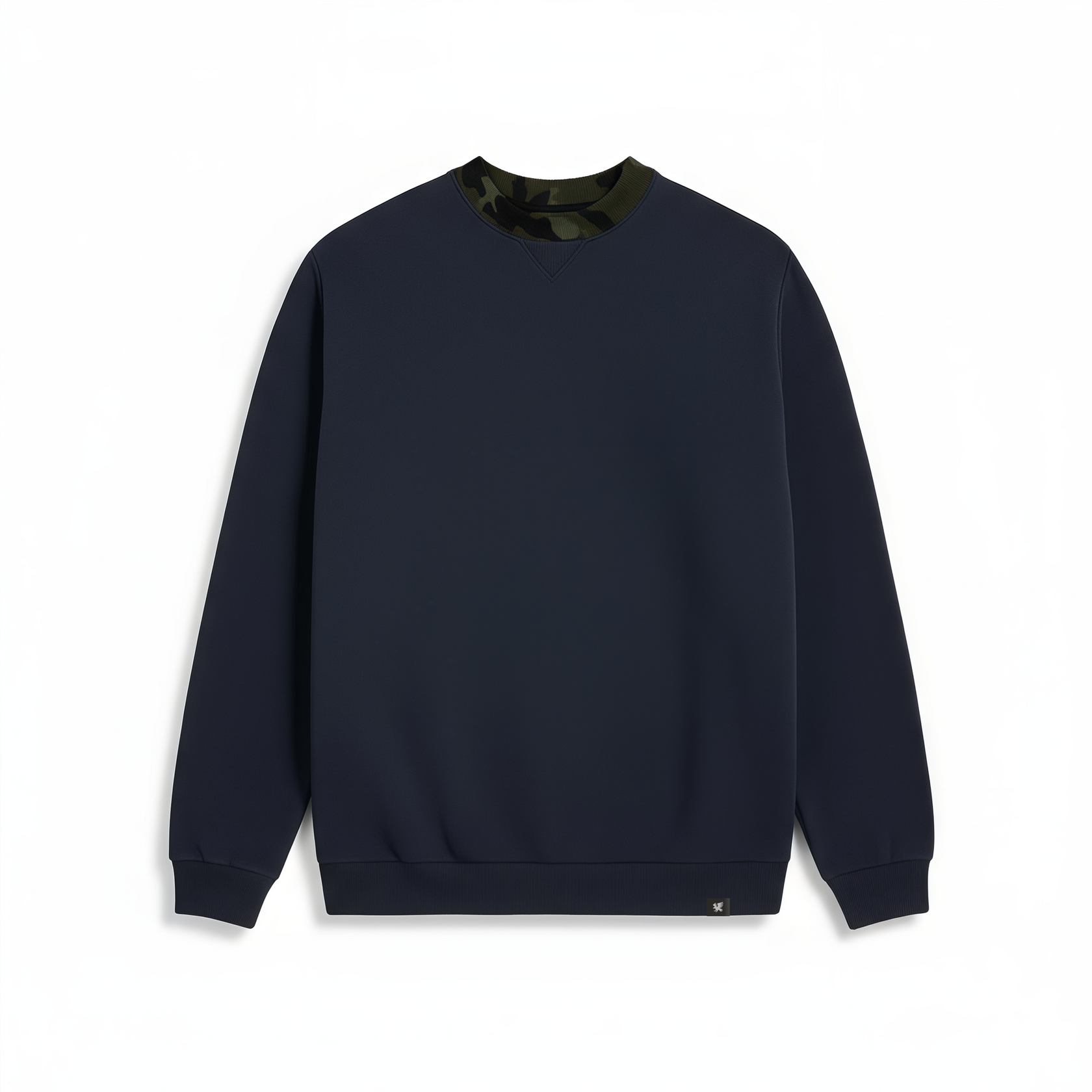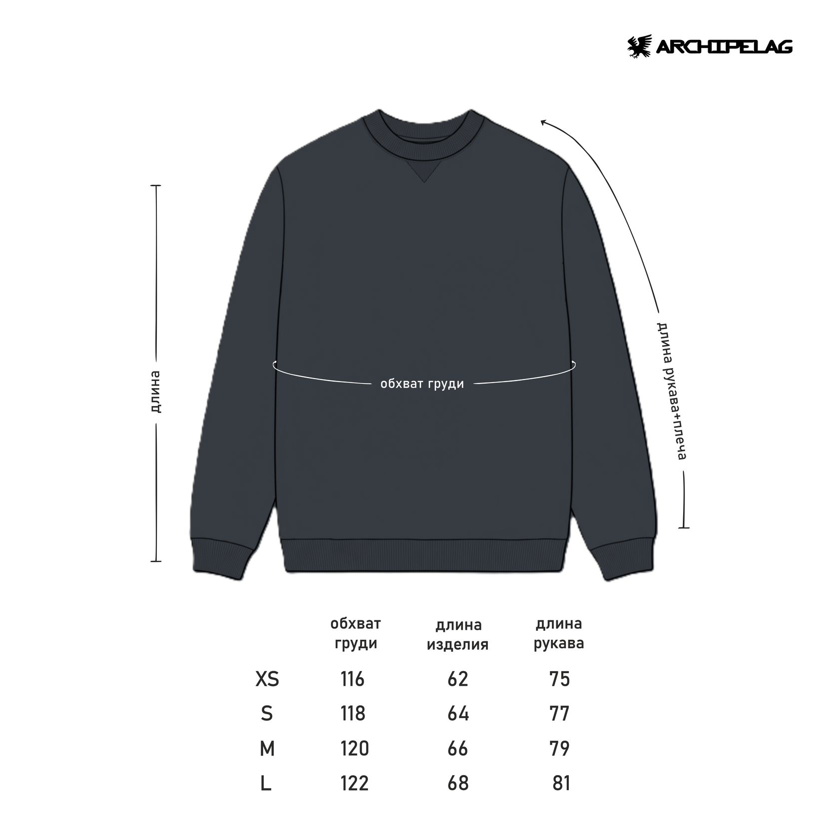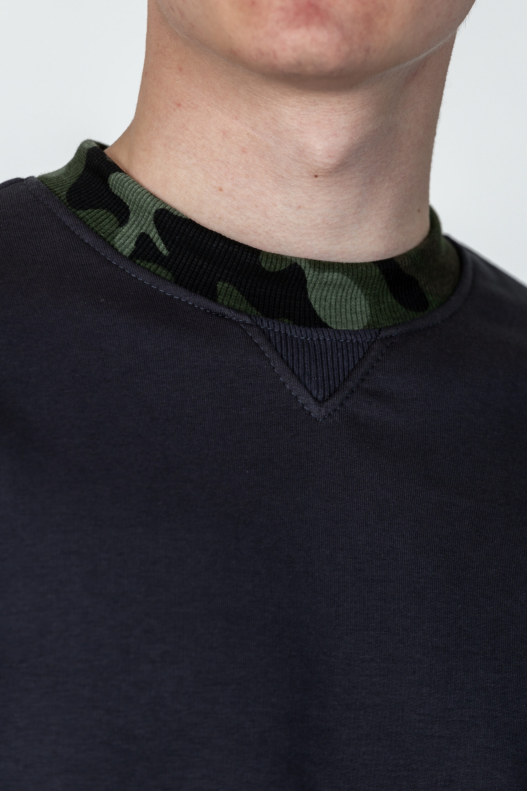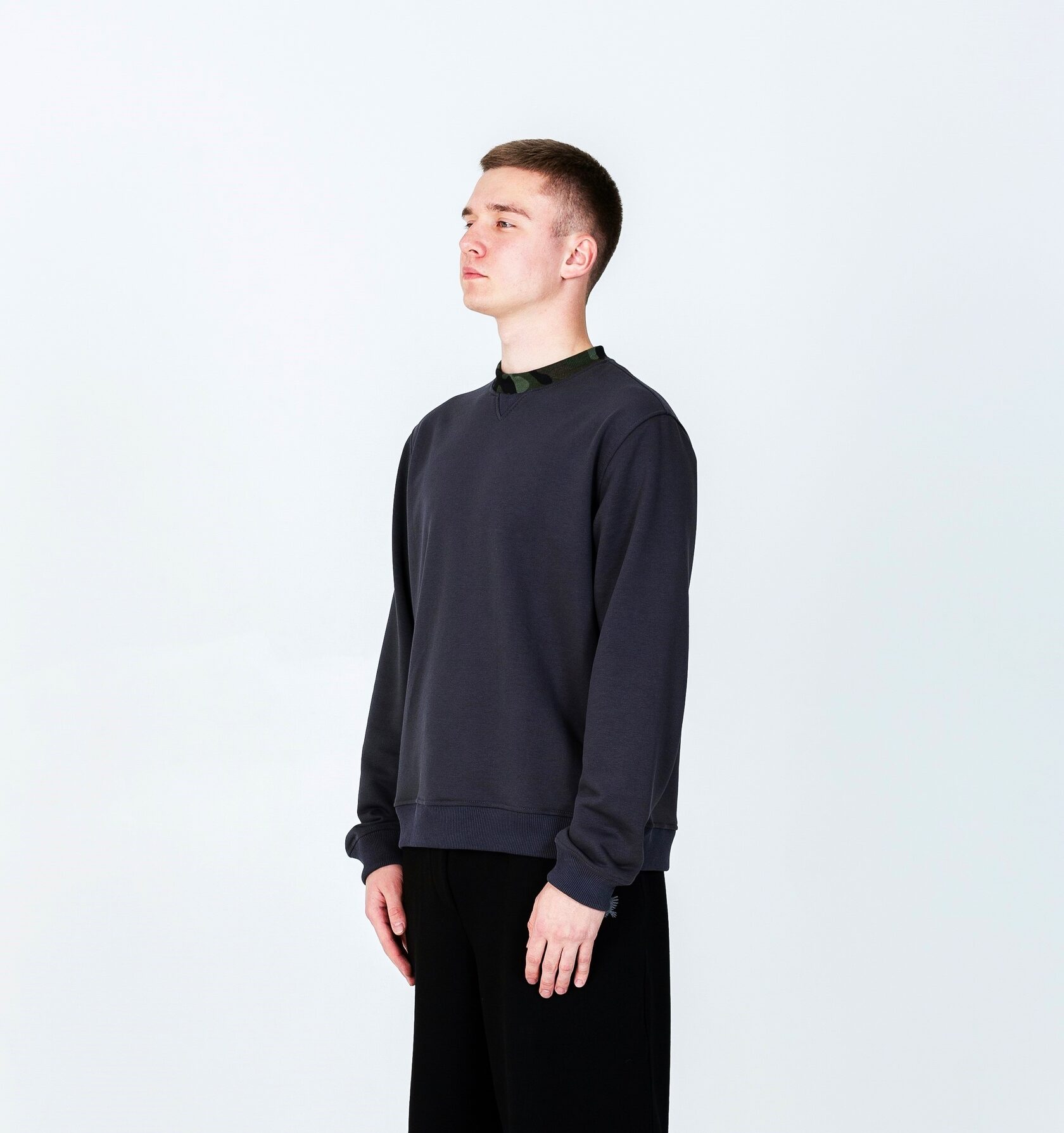 Свитшот Нави сине-графитового цвета из хлопкового футера плотностью 350 г/м². Материал — 85% хлопок/15% полиэстр, устойчив к деформации и износу. Крой прямой, ближе к классическому, позаимствованный у всеми любимого "Moncler". Вырез выполнен из окрашенного в камуфляж сублимированного хлопкового кашкорсе. Треугольный врезанный кусок манжета под ним придает уникальность изделию.